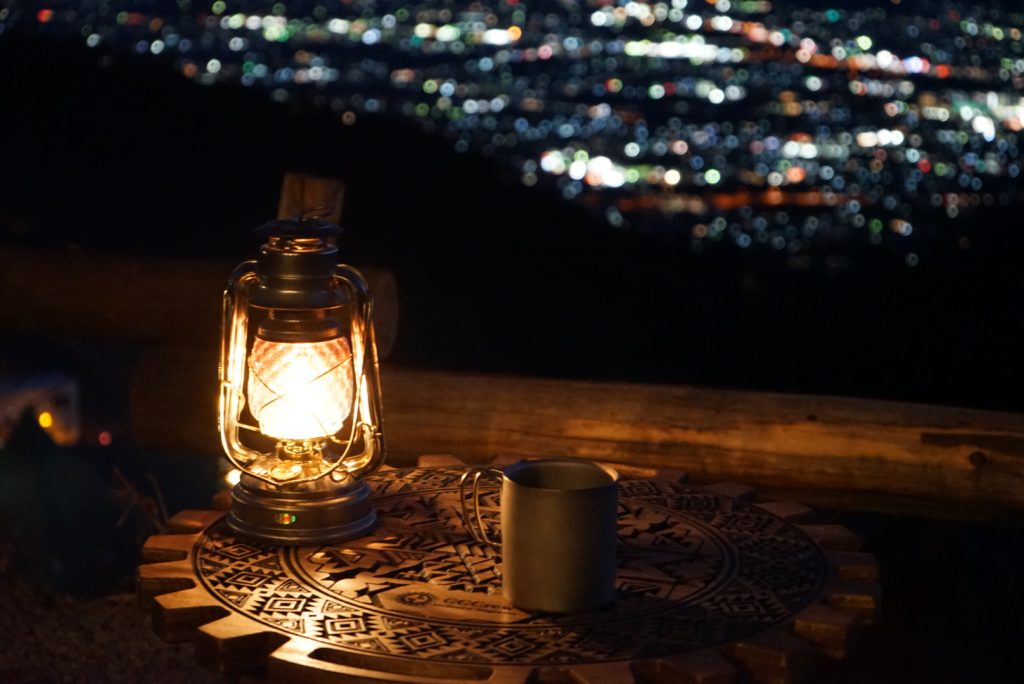 ランタンの光でも、また違った表情を見せてくれます。LEDの白い光なら現代的でシャープな印象に、オイルランタンの温かな光なら懐かしくノスタルジックな雰囲気に。光源によって、まったく違うテーブルのように見えるから不思議です。