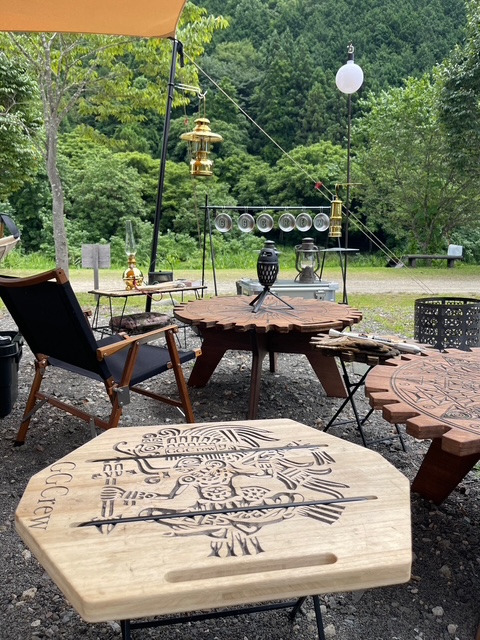 GGCrewの彫刻サイドテーブルは、あなたの想像力次第で、さまざまな使い方ができる万能アイテム。一枚のテーブルが、キャンプシーンを豊かに演出します。