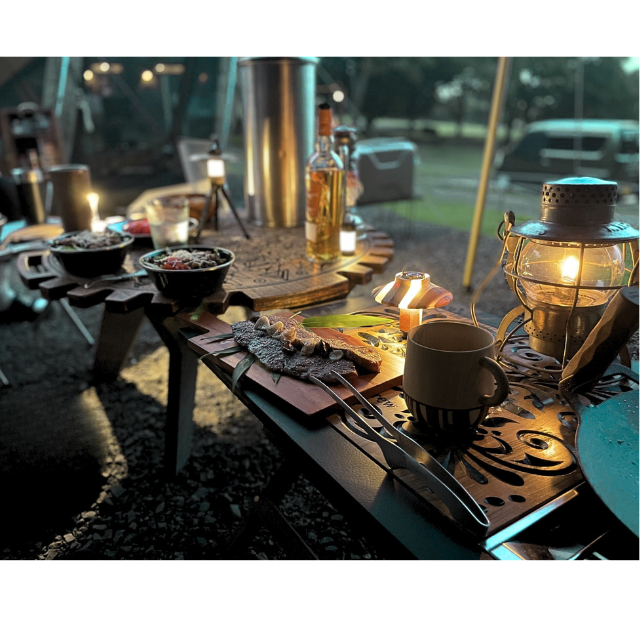 日中は機能的なテーブルとして、夜は光と影の芸術作品として。一つの天板が持つ二つの表情が、キャンプの時間をより豊かなものにしてくれます。