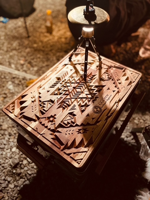 GGCrewの3ユニット天板なら、大きな一枚板の美しさを存分に味わえます。木目の流れが生み出すダイナミックな表情、大胆に施された彫刻の迫力。これだけの大きさがあれば、天板自体がキャンプサイトの主役になります。