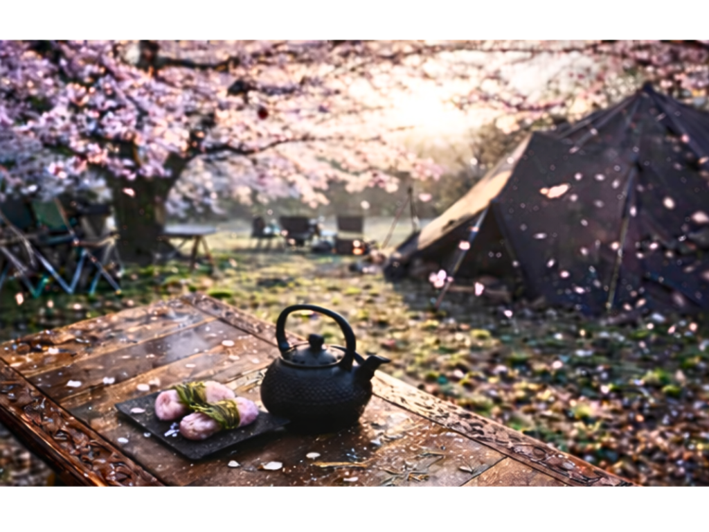 春のキャンプといえば、お花見キャンプ。桜の下に設置したIGT天板の上には、春らしい料理が並びます。桜餅、筍ご飯、春野菜の天ぷら。ピンク色の花びらが天板に舞い落ちる様子は、まるで一枚の絵画のよう。