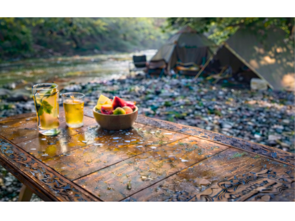 暑い夏のキャンプでは、天板の上に冷たい飲み物やフルーツを並べて、涼しげな演出を。レジン部分が水滴でキラキラと輝く様子は、見ているだけで涼しさを感じさせてくれます。