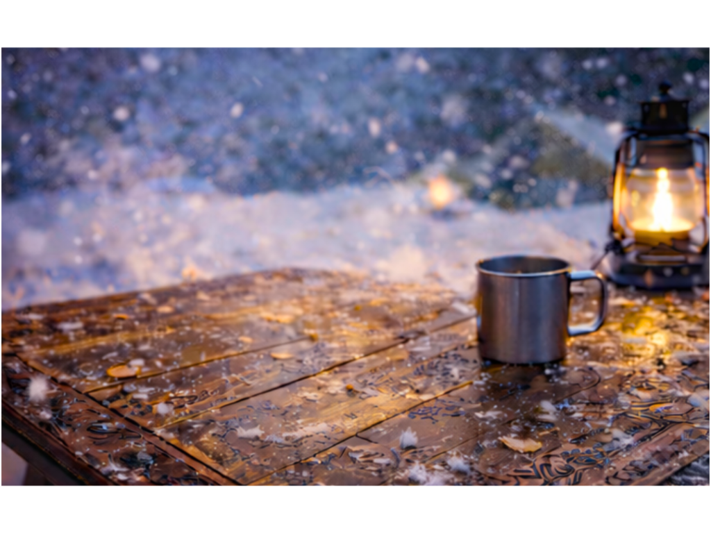雪が降る静かな夜、ランタンの灯りで照らされた天板の上で楽しむ熱燗。時折天板に舞い落ちる雪の結晶を眺めながら、冬の静寂を楽しむ。そんな贅沢な時間も、GGCrewの天板があればこそです。