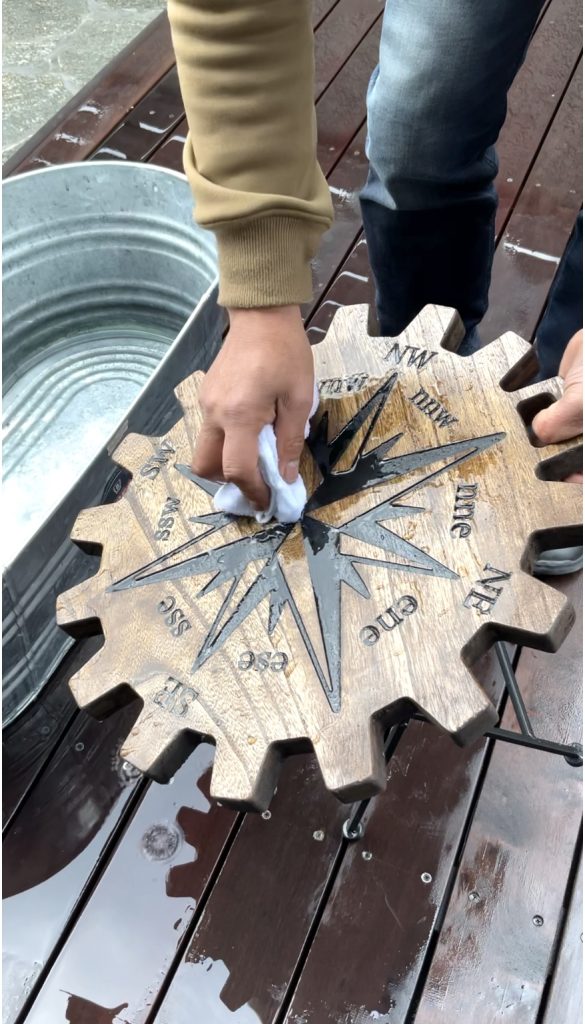 オイルを塗る際は、薄く均一に伸ばし、余分なオイルは拭き取ります。一晩置いて、翌日もう一度乾拭きすれば完了です。この作業により、木目がより鮮明になり、天板全体の印象が引き締まります。